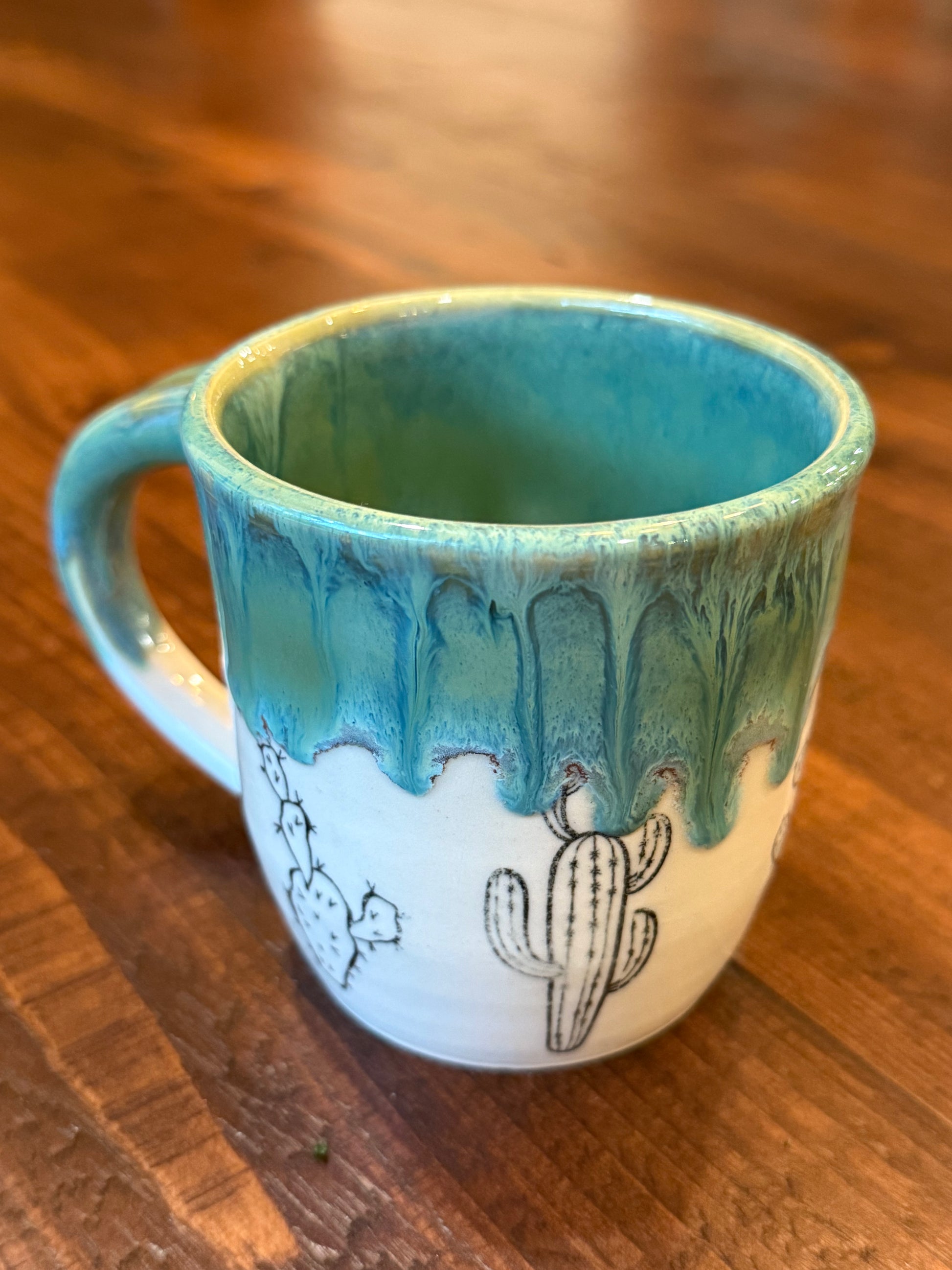 Beautiful 9-10 oz mug perfect for a cup of coffee or tea. The mug has a lovely green glaze that drips down with accents of brown and blue. The cactus underglaze pattern at the bottom is just the cutest!