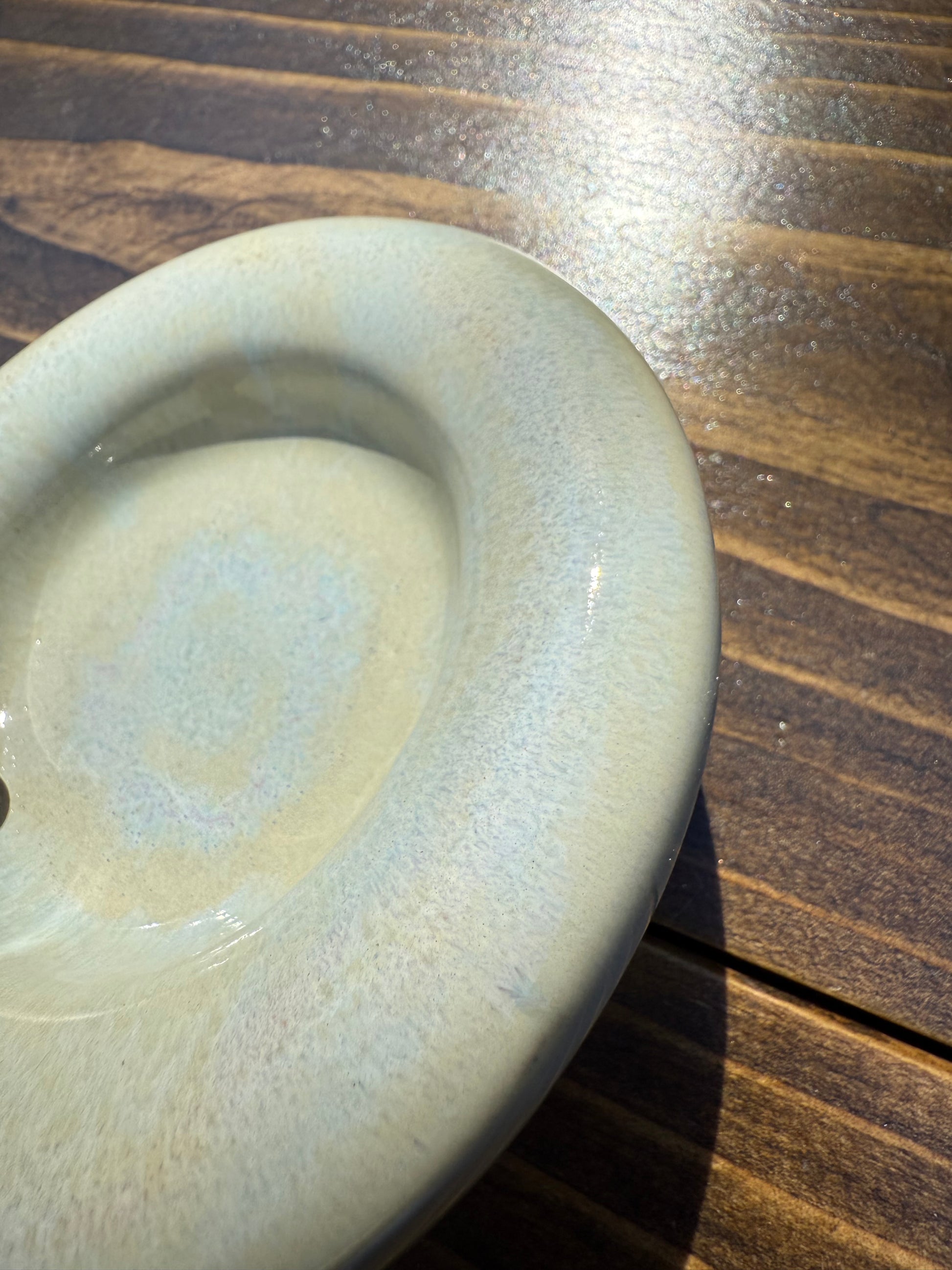 This beautiful little jewelry holder is perfect to set your rings, earrings, or a necklace on. It has a pretty light faint blue color with a creamy undertone.