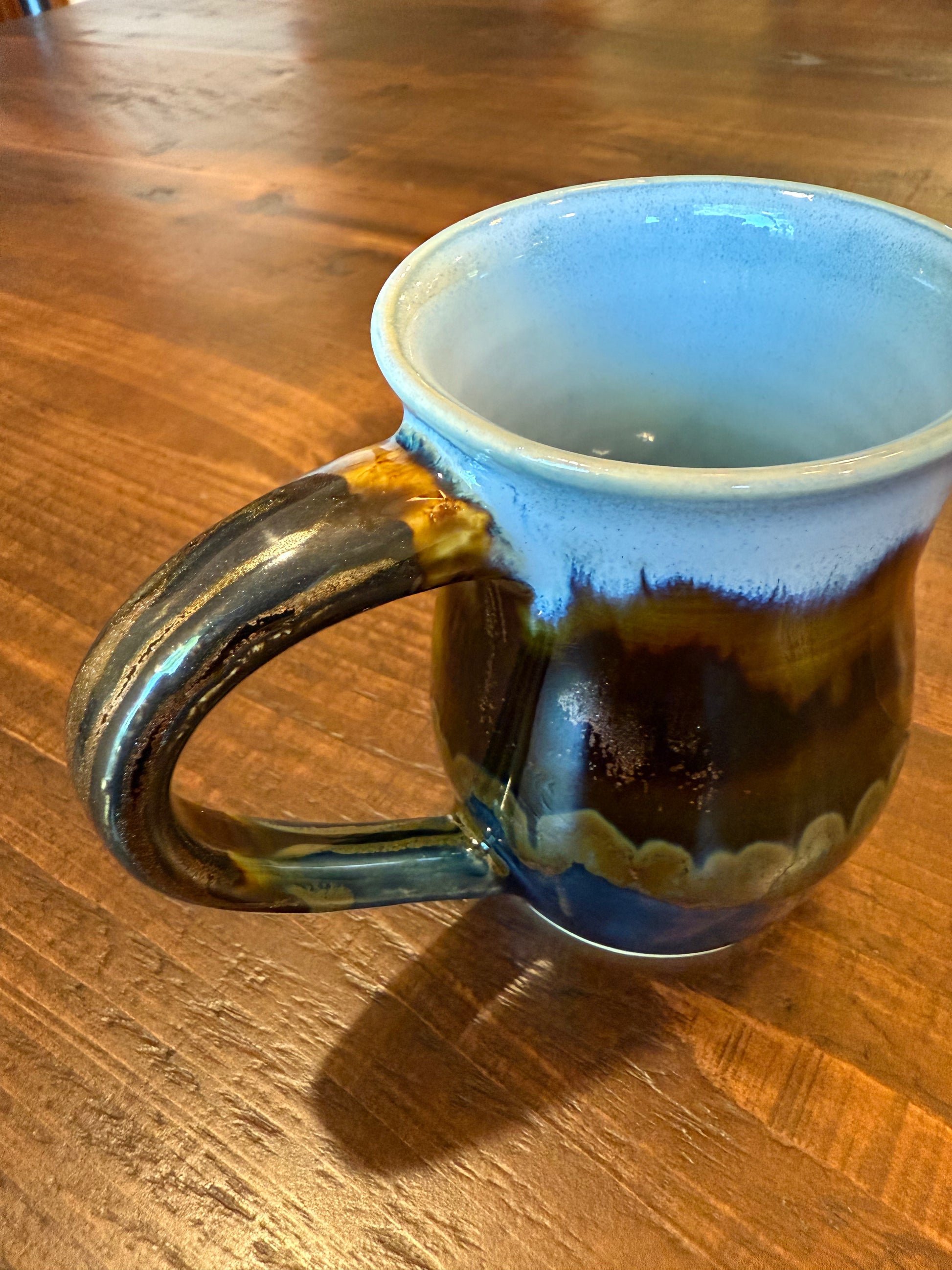 Beautiful 8-9 oz mugs perfect for a cup of coffee or tea. The mug has a soft light blue glaze dripping down into a coppery black glaze accented by a deep watery blue at the bottom. It reminds me of a mountain springs from the snowy top to the fresh water bottom.
